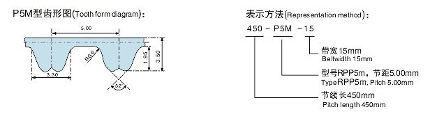 標(biāo)準(zhǔn)設(shè)計(jì)參考值:節(jié)距:5mm;齒高:1.81mm;帶厚:3.6mm